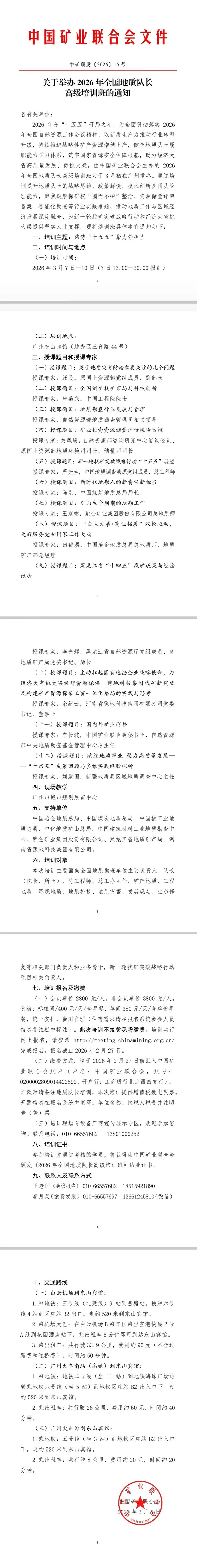 2026年是“十五五”开局之年,为全面贯彻落实2026年全国自然资源工作会议精神,以新质生产力推动行业转型升级,持续推进战略性矿产资源增储上产,健全地质队长履职能力学习体系,筑牢国家资源安全保障根基,助力经济大省高质量发展、勇挑大梁。由中国矿业联合会主办的2026年全国地质队长高级培训班定于3月初在广州举办。通过培训提升地质队长的战略思维、政策解读、技术创新及团队管理能力,聚焦破解探矿权“圈而不探”整治、资源储量评审备案、智能化勘查等行业实践难题,推动地质工作与区域经济发展深度融合,为新一轮找矿突破战略行动和经济大省挑大梁提供坚实人才支撑。